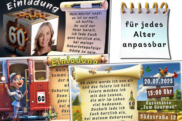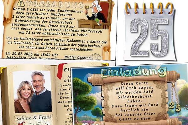 Ob Geburtstag, Hochzeit, Silberhochzeit, Goldene Hochzeit oder ein anderes Jubiläum – bei uns finden Sie liebevoll gestaltete Einladungskarten, Danksagungskarten und Tischkarten, die Ihre besonderen Momente unvergesslich machen. Wählen Sie aus einer Vielzahl an Designs. Hochwertiger Druck auf Fotopapier, schnelle Lieferung und ein persönlicher Service machen uns zu Ihrem zuverlässigen Partner für jede Feier.