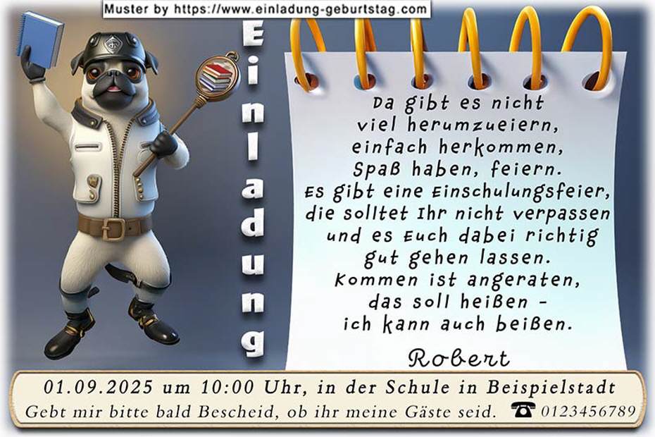 Ein Mops in Lederkluft lädt ein. Auf dem Schild befindet sich die ersten Schulbücher.