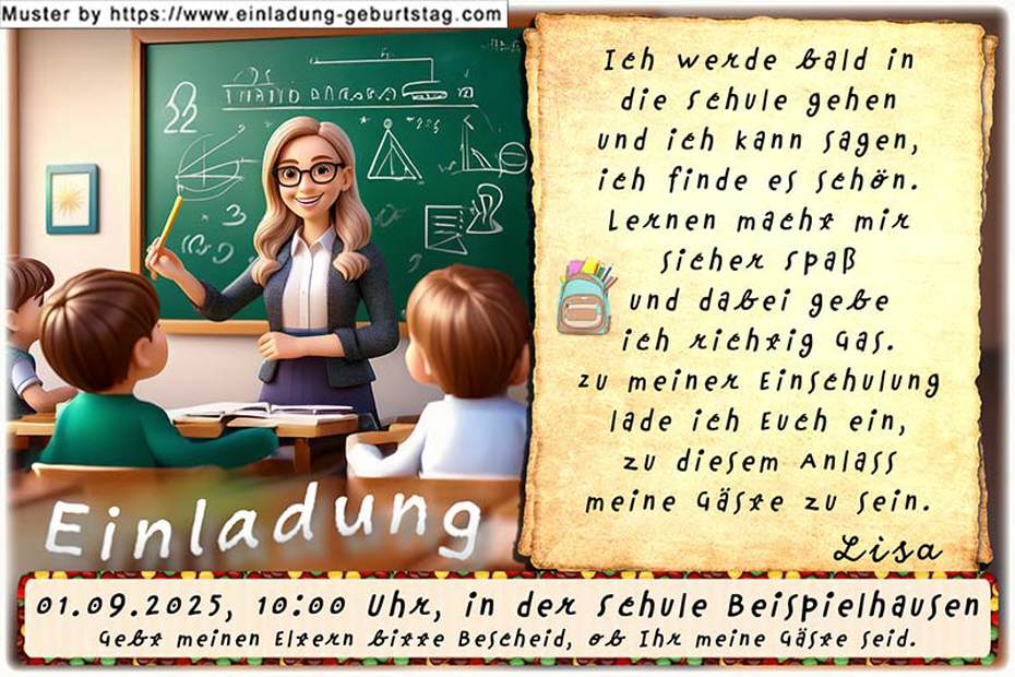 Beispiel: Ich werde bald in die Schule gehen und ich kann sagen, ich finde es schön. Lernen macht mir sicher Spaß und dabei gebe ich richtig Gas. Zu meiner Einschulung lade ich Euch ein, zu diesem Anlass meine Gäste zu sein.