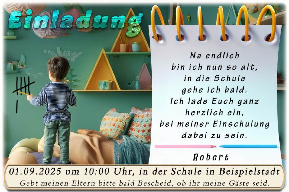 Beispiel: Na endlich bin ich nun so alt, in die Schule gehe ich bald. Ich lade Euch ganz herzlich ein, bei meiner Einschulung dabei zu sein.