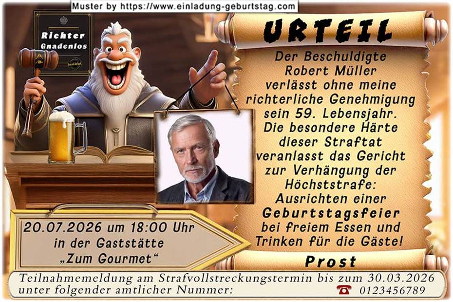 Ein Richter hält Ihr Foto hoch, daneben befindet sich der Urteilsspruch: Ausrichten einer Geburtstagsfeier. Unter den Richter werden die Angaben zu Datum, Uhrzeit und Ort eingesetzt.