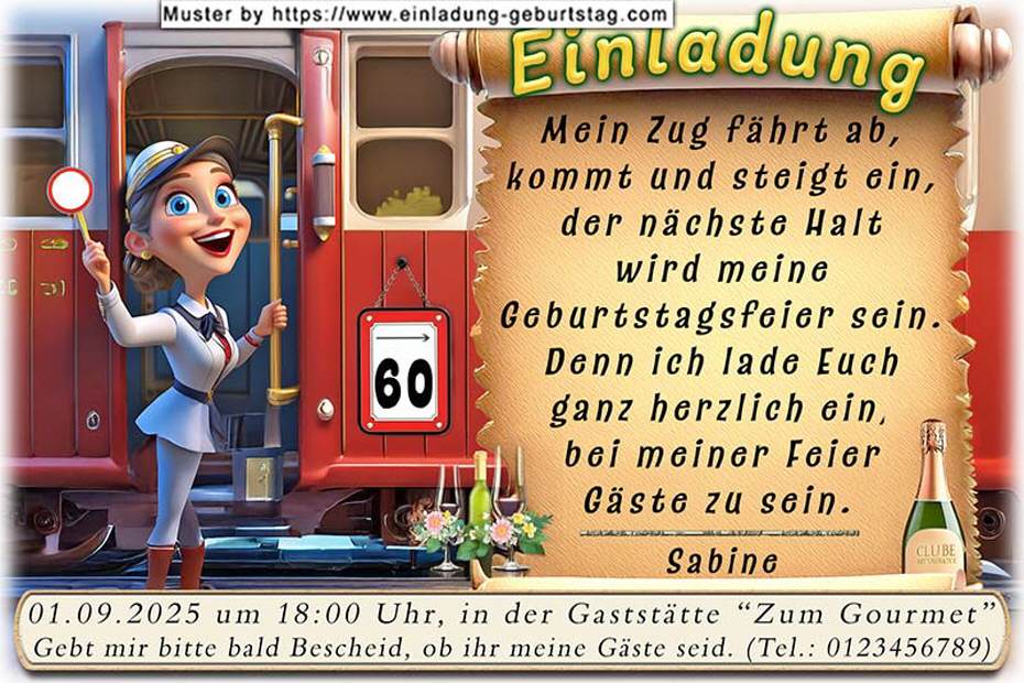 Beispiel: Mein Zug fährt ab, kommt und steigt ein, der nächste Halt wird meine Geburtstagsfeier sein. Denn ich lade Euch ganz herzlich ein, bei meiner Feier Gäste zu sein.