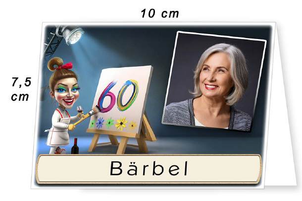 Ihr Foto wird mit einer Kontur versehen und leicht schräg gestellt rechts in die Karte eingesetzt. Auf der Leinwand befindet sich Ihr Alter. Unten auf die Karte wird der Name des Gastes gedruckt. Auf Wunsch kann das untere Textfeld zum selbst beschriften leer bleiben. Dies können Sie im Warenkorb wählen.