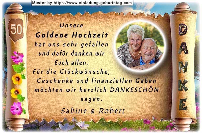 Ihr Foto wird rund ausgeschnitten und rechts neben Ihrem frei wählbaren Danksagungstext auf eine Schriftrolle gedruckt. Unter dem Text befinden sich Ihre Namen.