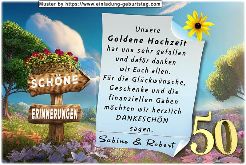 Auf einem Wegweiser befindet sich der Schriftzug schöne Erinnerungen. Den Danksagungstext auf dem Textfeld können Sie frei gestalten. Darunter werden Ihre Namen eingesetzt.