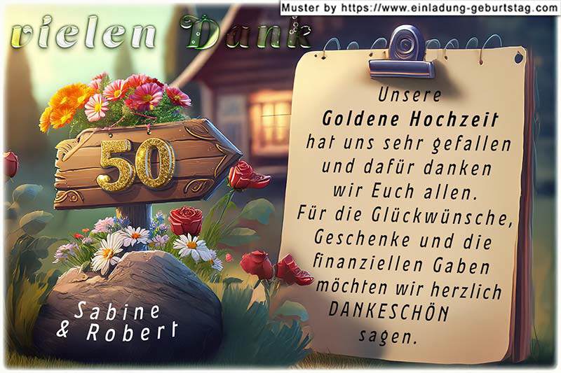 Ihre Jubiläumszahl auf einem alten Holzwegweiser. Darunter befinden sich Ihre Namen. Den Danksagungstext können Sie individuell anpassen.