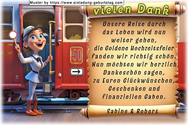 Nach einem Halt zu Ihrer Goldenen Hochzeitsfeier geht die Reise durch Ihr Leben nun weiter. Den Danksagungstext können Sie individuell anpassen.