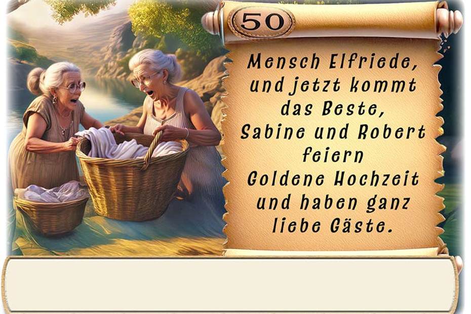 Ihre Namen werden in den Text auf der rechten Kartenseite eingebunden. Ihre Jubiläumszahl befindet sich oben links auf der Schriftrolle. Der Name des Gastes wird in das Textfeld unten gedruckt. Auf Wunsch kann das untere Textfeld zum selbst beschriften leer bleiben. Dies können Sie im Warenkorb wählen.