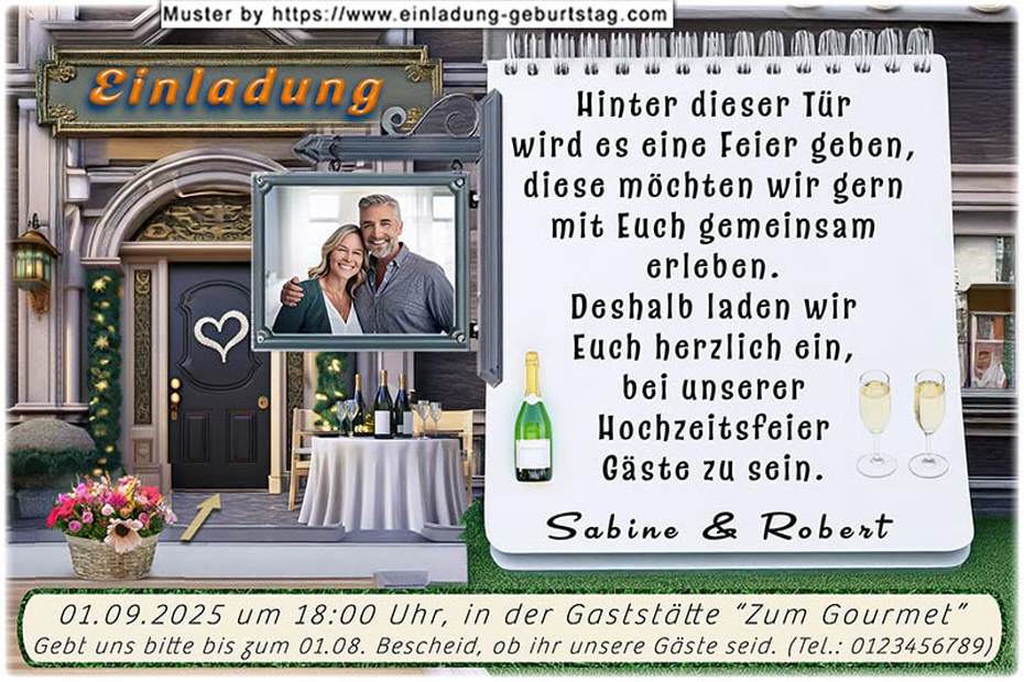 1. Ein Vorschaubild der Einladungskarte mit einem Beispieltext. Diese Ansicht entspricht (mit Ihrem Wunschtext) der Vorderansicht einer Fotokarte (Rückseite ist weiß und nicht bedruckbar) oder der Außenseite einer Klappkarte.