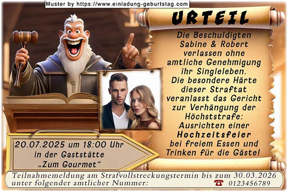 Ein Richter hält Ihr Foto hoch, daneben befindet sich der Urteilsspruch: Ausrichten einer Hochzeitsfeier. Unter den Richter werden die Angaben zu Datum, Uhrzeit und Ort eingesetzt.