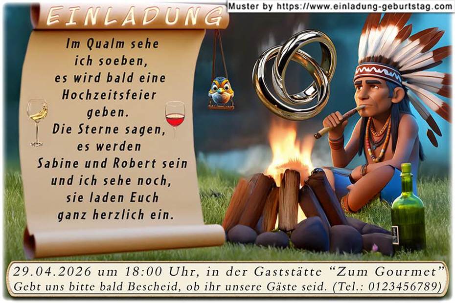 Die Weissagung des Qualms einer Friedenspfeife. Ihre Namen werden in den Einladungstext eingebunden.