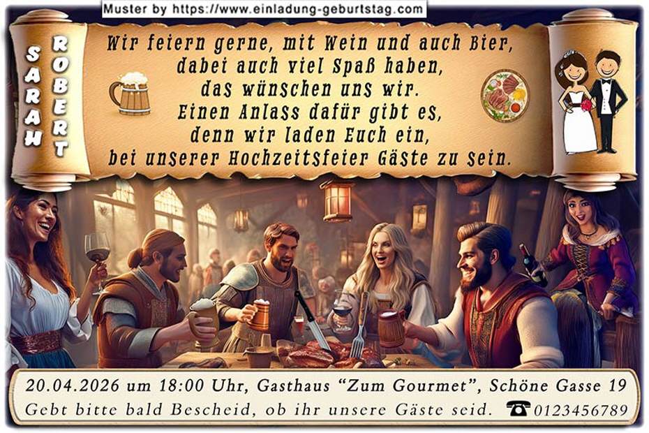 Beispiel: Wir feiern gerne, mit Wein und auch Bier, dabei auch viel Spaß haben, das wünschen uns wir. Einen Anlass dafür gibt es, denn wir laden Euch ein, bei unserer Hochzeitsfeier Gäste zu sein.