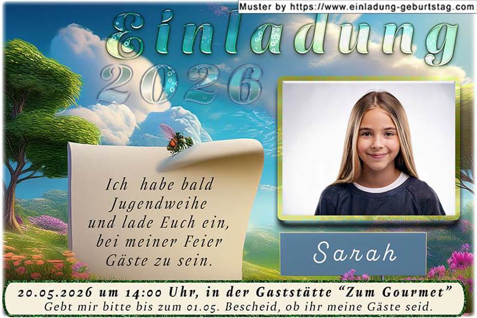Unter das Foto wird dein Name eingesetzt. Über dem Einladungstext befindet sich die Jahreszahl.