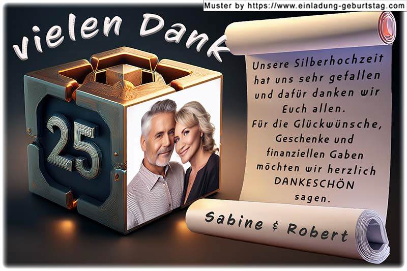 Beispiel: Unsere Silberhochzeit hat uns sehr gefallen und dafür danken wir Euch allen. Für die Glückwünsche, Geschenke und die finanziellen Gaben möchten wir herzlich DANKESCHÖN sagen.