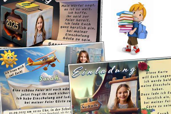 Gestalten Sie persönliche Einladungskarten zur Einschulung mit eigenem Foto. Wählen Sie aus liebevollen Designs, fügen Sie Ihr Bild und Text ein – einfach online erstellen & drucken lassen. So wird der Schulanfang unvergesslich!