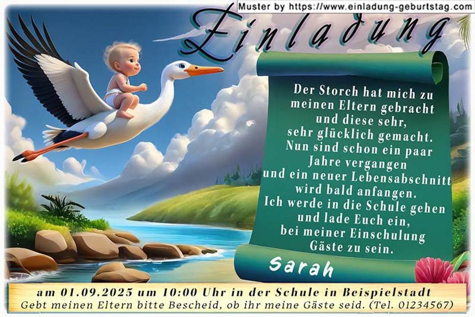 Beispiel: Der Storch hat mich zu meinen Eltern gebracht und diese sehr, sehr glücklich gemacht. Nun sind schon ein paar Jahre vergangen und ein neuer Lebensabschnitt wird bald anfangen. Ich werde in die Schule gehen und lade Euch ein, bei meiner Einschulung Gäste zu sein.