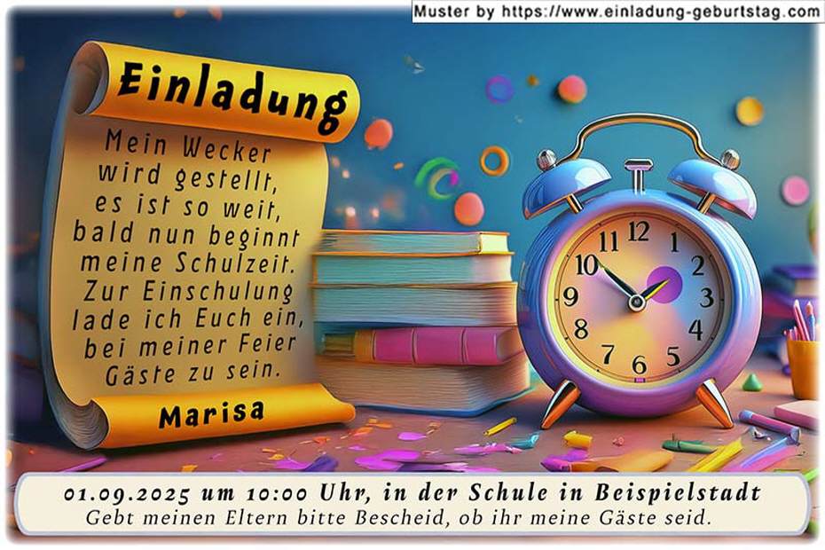 Beispiel: Mein Wecker wird gestellt, es ist so weit, bald nun beginnt meine Schulzeit. Zur Einschulung lade ich Euch ein, bei meiner Feier Gäste zu sein.