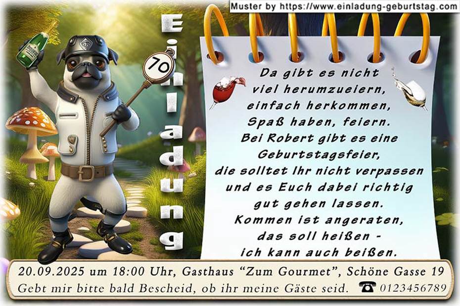 Nach dem Eingang Ihrer Bestellung erhalten Sie ein Vorschaubild der Einladungskarte per E-Mail (während der Geschäftszeiten - mit Wasserzeichen MUSTER)). Dann haben Sie die Möglichkeit, den Druck freizugeben oder Änderungswünsche zu äußern. Dies können Sie per E-Mail (webmaster@einladung-geburtstag.com) oder Telefon (03544 5589 356) erledigen. Beide Angaben befinden sich in der E-Mail mit dem Vorschaubild.