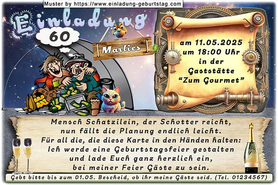 Beispiel: Mensch Schatzilein, der Schotter reicht, nun fällt die Planung endlich leicht. Für all die, die diese Karte in den Händen halten: Ich werde eine Geburtstagsfeier gestalten und lade Euch ganz herzlich ein, bei meiner Feier Gäste zu sein.