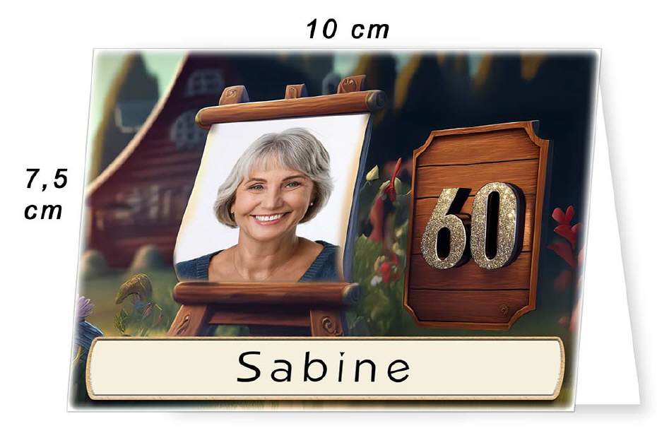 Ihr Foto wird in eine Staffelei eingesetzt. Ihr Alter befindet sich rechts daneben. Der Name des Gastes wird in das Textfeld unten gedruckt. Auf Wunsch kann das untere Textfeld zum selbst beschriften leer bleiben. Dies können Sie im Warenkorb wählen.