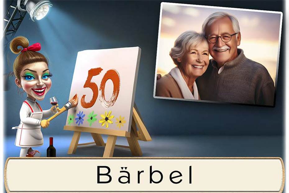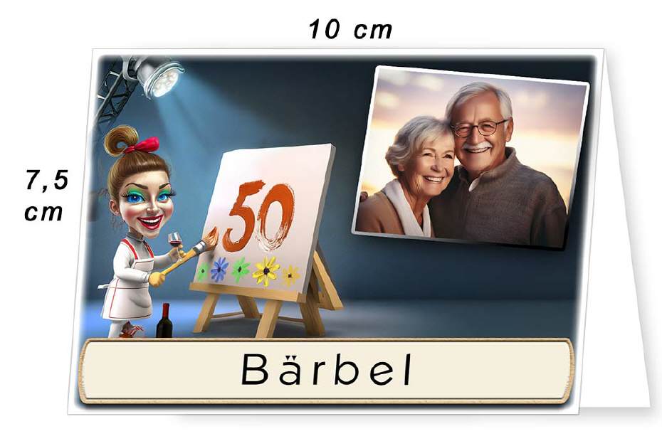 Ihr Foto wird mit einer Kontur versehen und leicht schräg gestellt rechts in die Karte eingesetzt. Auf der Leinwand befindet sich Ihre Jubiläumszahl. Unten auf die Karte wird der Name des Gastes gedruckt. Auf Wunsch kann das untere Textfeld zum selbst beschriften leer bleiben. Dies können Sie im Warenkorb wählen.