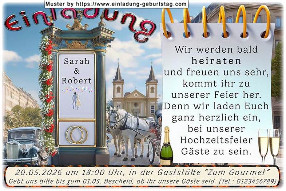 Sie erhalten nach dem Eingang Ihrer Bestellung ein Vorschaubild Ihrer Einladung per E-Mail (mit Wasserzeichen - MUSTER). Dieses wird Ihnen während der Geschäftszeiten als Anhang einer separaten E-Mail gesendet.