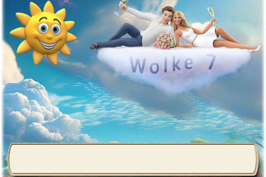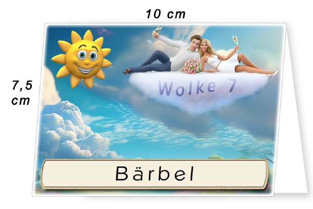 Das Hochzeitspaar schwebt auf Wolke 7, mit Sektgläsern in der Hand. Der Name des Gastes wird in das Textfeld unten gedruckt. Auf Wunsch kann das untere Textfeld zum selbst beschriften leer bleiben. Dies können Sie im Warenkorb wählen.