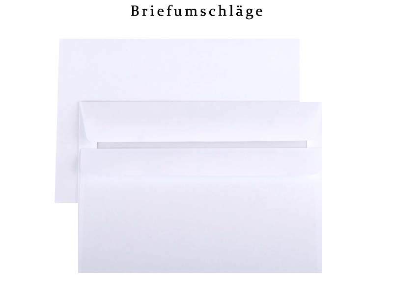 Im Warenkorb können Sie unter - Kartentyp und mit/ohne Briefumschlag - wählen, ob Sie passende Briefumschläge wünschen. Die Briefumschläge sind weiß und haben das Format C6. Falls Sie Briefumschläge mit bestellen, werden die bestellten Karten in die Briefumschläge eingesteckt, aber offen gelassen (noch nicht verklebt).