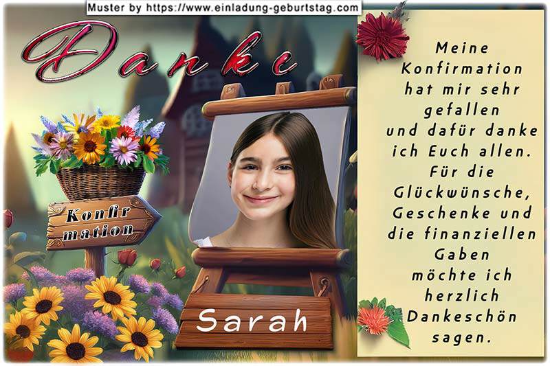 Dein Foto wird in die Staffelei eingesetzt. Auf dem Wegweiser befindet sich das Wort Konfirmation. Den Danksagungstext kannst du individuell anpassen.