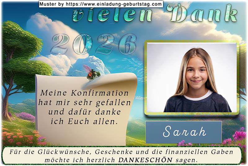 Dein Foto wird mit einer Kontur versehen und rechts in die Karte eingesetzt. Darunter befindet sich dein Name. Der Danksagungstext wird auf die beiden Textfelder verteilt.