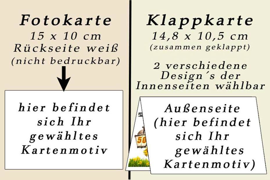 als Fotokarte (Rückseite weiß und nicht bedruckbar) oder als Klappkarte lieferbar (zusätzlich können Innenseiten mit Text oder Foto versehen werden oder leer bleiben zum selbst beschriften)