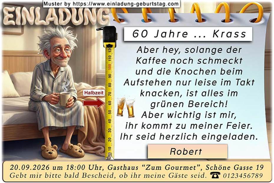 Beispiel: Aber hey, solange der Kaffee noch schmeckt und die Knochen beim Aufstehen nur leise im Takt knacken, ist alles im grünen Bereich! Aber wichtig ist mir, ihr kommt zu meiner Feier. Ihr seid herzlich eingeladen.