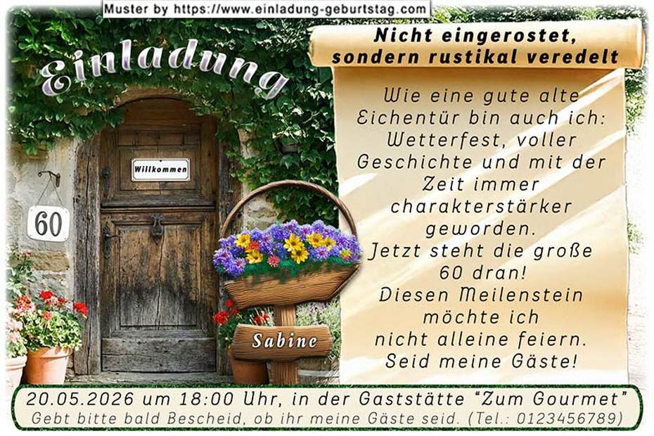 Beispiel: Wie eine gute alte Eichentür bin auch ich: Wetterfest, voller Geschichte und mit der Zeit immer charakterstärker geworden. Jetzt steht die große 60 dran! Diesen Meilenstein möchte ich nicht alleine feiern. Seid meine Gäste! (oder nur das Wort Beispieltext, Ihr Alter wird aus der folgenden Angabe übernommen)