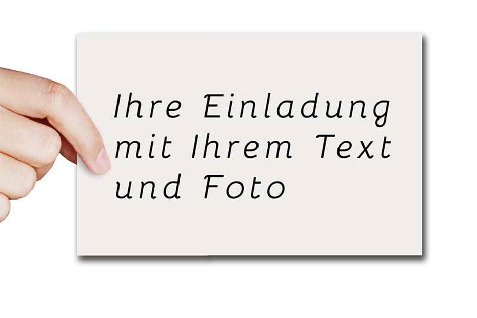1. Ein Vorschaubild der Einladungskarte mit einem Beispieltext. Diese Ansicht entspricht (mit deinem Wunschtext) der Vorderansicht einer Fotokarte (Rückseite ist weiß und nicht bedruckbar) oder der Außenseite einer Klappkarte.
