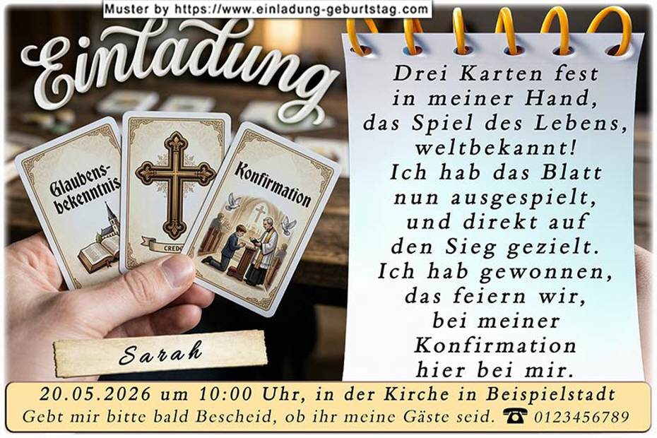 1. Ein Vorschaubild der Einladungskarte mit einem Beispieltext. Diese Ansicht entspricht (mit deinem Wunschtext) der Vorderansicht einer Fotokarte (Rückseite ist weiß und nicht bedruckbar) oder der Außenseite einer Klappkarte.