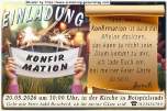 2 Hände halten ein Banner mit der Aufschrift Konfirmation. Dein Einladungstext und dein Name werden auf eine Schriftrolle gedruckt.