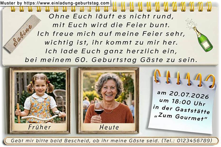 1. Ein Vorschaubild der Einladungskarte mit einem Beispieltext. Diese Ansicht entspricht (mit Ihrem Wunschtext) der Vorderansicht einer Fotokarte (Rückseite ist weiß und nicht bedruckbar) oder der Außenseite einer Klappkarte.