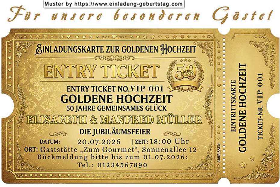 Ein goldenes Ticket für Ihre Gäste passend zu Ihrer Goldenen Hochzeit.