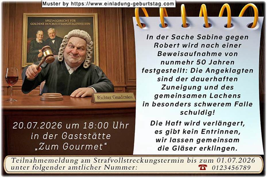 Beispiel: In der Sache Sabine gegen Robert wird nach einer Beweisaufnahme von nunmehr 50 Jahren festgestellt: Die Angeklagten sind der dauerhaften Zuneigung und des gemeinsamen Lachens in besonders schwerem Falle schuldig! Die Haft wird verlängert, es gibt kein Entrinnen, wir lassen gemeinsam die Gläser erklingen. (oder nur das Wort Beispieltext und Ihre Namen)