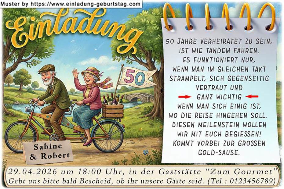 Beispiel: 50 Jahre verheiratet zu sein, ist wie Tandem fahren. Es funktioniert nur, wenn man im gleichen Takt strampelt, sich gegenseitig vertraut und – ganz wichtig – wenn man sich einig ist, wo die Reise hingehen soll. Diesen Meilenstein wollen wir mit euch begießen! Kommt vorbei zur großen Gold-Sause.