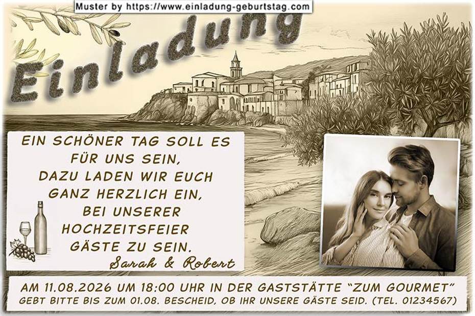 Die Einladungskarte komplett im Sepia Farblook. Auch Ihr Foto wird mit einer Sepia Farbüberlagerung versehen und rechts unten eingesetzt.