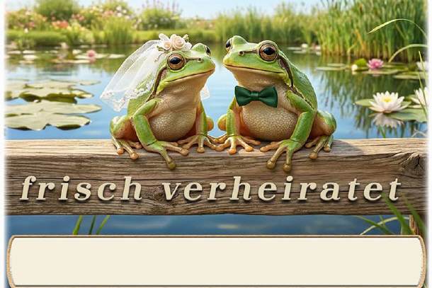 frisch verheiratet - unten auf die Karte wird der Name des Gastes gedruckt. Auf Wunsch kann das untere Textfeld zum selbst beschriften leer bleiben. Dies können Sie im Warenkorb wählen.