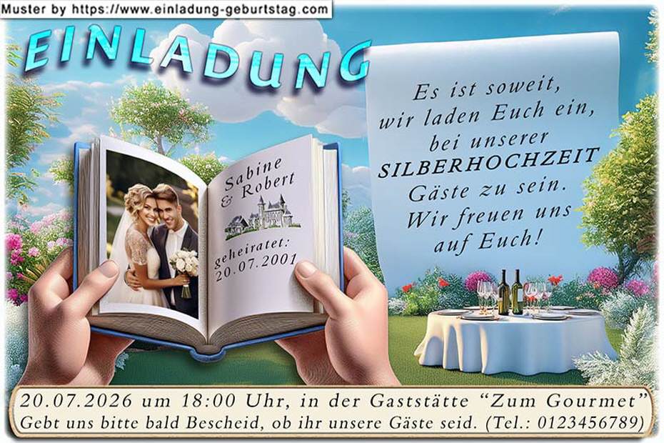 Beispiel: Es ist soweit, wir laden Euch ein, bei unserer SILBERHOCHZEIT Gäste zu sein. Wir freuen uns auf Euch!