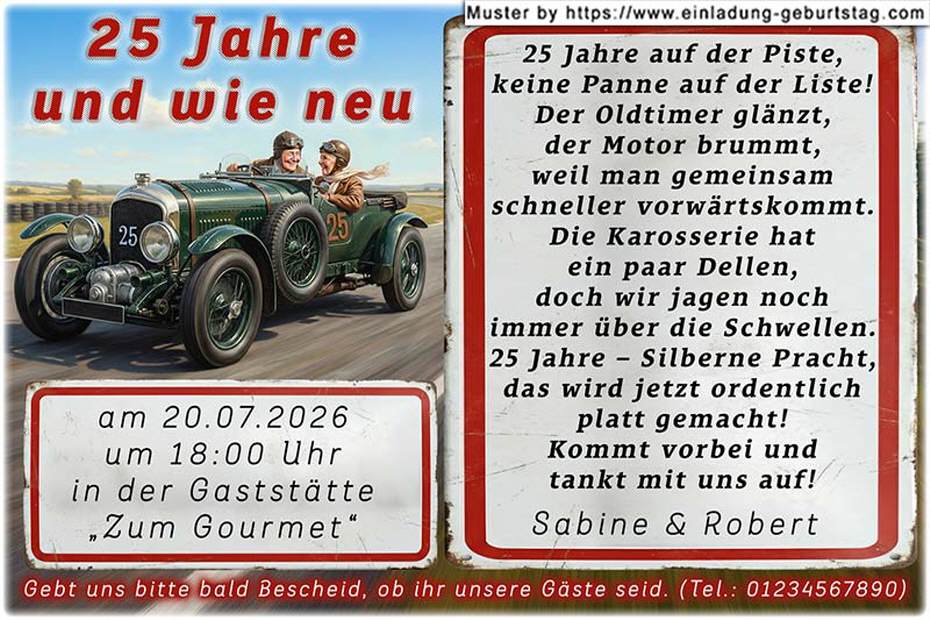 25 Jahre auf der Piste, keine Panne auf der Liste! Der Oldtimer glänzt, der Motor brummt, weil man gemeinsam schneller vorwärtskommt. Die Karosserie hat ein paar Dellen, doch wir jagen noch immer über die Schwellen. 25 Jahre – Silberne Pracht, das wird jetzt ordentlich platt gemacht! Kommt vorbei und tankt mit uns auf!